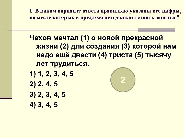 1. В каком варианте ответа правильно указаны все цифры, на месте которых в предложении должны стоять запятые? Чехов мечтал (1) о новой прекрасной жизни (2) для создания (3) которой нам надо ещё двести (4) триста (5) тысячу лет трудиться. 1) 1, 2, 3, 4, 5 2 2) 2, 4, 5 3) 2, 3, 4, 5 4) 3, 4, 5