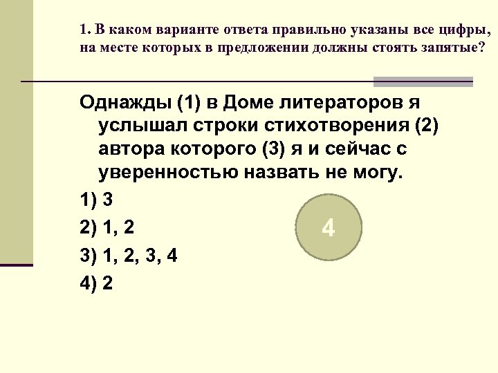 1. В каком варианте ответа правильно указаны все цифры, на месте которых в предложении должны стоять запятые? Однажды (1) в Доме литераторов я услышал строки стихотворения (2) автора которого (3) я и сейчас с уверенностью назвать не могу. 1) 3 2) 1, 2 4 3) 1, 2, 3, 4 4) 2