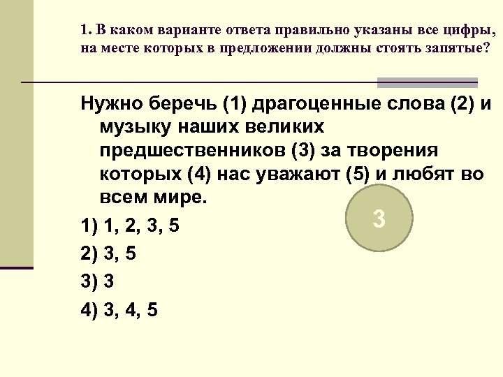 1. В каком варианте ответа правильно указаны все цифры, на месте которых в предложении должны стоять запятые? Нужно беречь (1) драгоценные слова (2) и музыку наших великих предшественников (3) за творения которых (4) нас уважают (5) и любят во всем мире. 3 1) 1, 2, 3, 5 2) 3, 5 3) 3 4) 3, 4, 5