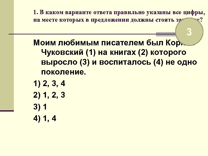 1. В каком варианте ответа правильно указаны все цифры, на месте которых в предложении должны стоять запятые? 3 Моим любимым писателем был Корней Чуковский (1) на книгах (2) которого выросло (3) и воспиталось (4) не одно поколение. 1) 2, 3, 4 2) 1, 2, 3 3) 1 4) 1, 4