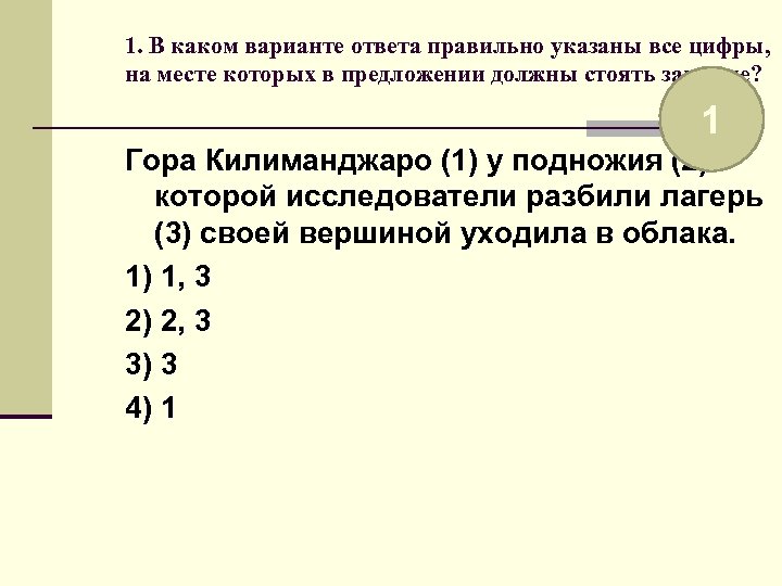 1. В каком варианте ответа правильно указаны все цифры, на месте которых в предложении должны стоять запятые? 1 Гора Килиманджаро (1) у подножия (2) которой исследователи разбили лагерь (3) своей вершиной уходила в облака. 1) 1, 3 2) 2, 3 3) 3 4) 1