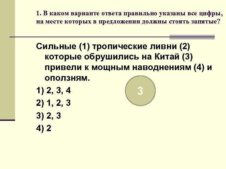 1. В каком варианте ответа правильно указаны все цифры, на месте которых в предложении должны стоять запятые? Сильные (1) тропические ливни (2) которые обрушились на Китай (3) привели к мощным наводнениям (4) и оползням. 1) 2, 3, 4 3 2) 1, 2, 3 3) 2, 3 4) 2