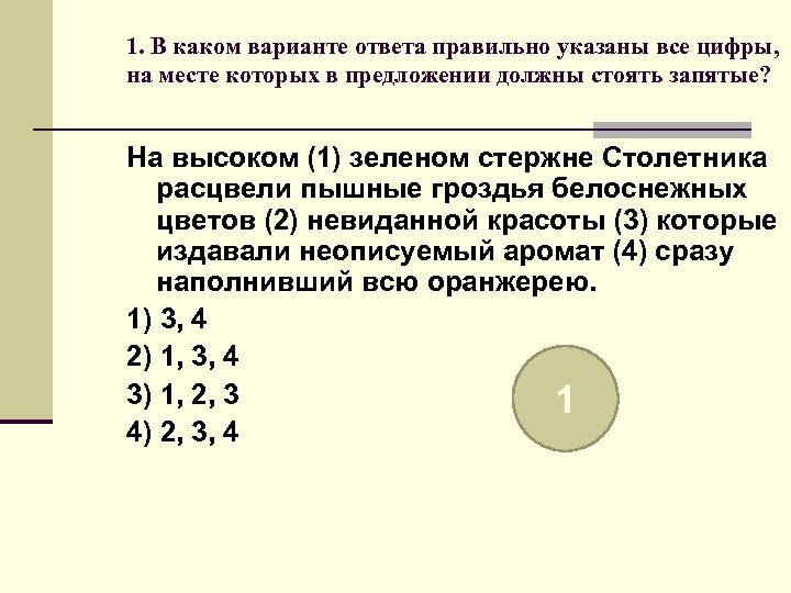 1. В каком варианте ответа правильно указаны все цифры, на месте которых в предложении должны стоять запятые? На высоком (1) зеленом стержне Столетника расцвели пышные гроздья белоснежных цветов (2) невиданной красоты (3) которые издавали неописуемый аромат (4) сразу наполнивший всю оранжерею. 1) 3, 4 2) 1, 3, 4 3) 1, 2, 3 1 4) 2, 3, 4