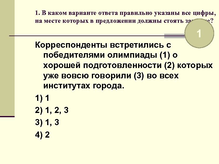 1. В каком варианте ответа правильно указаны все цифры, на месте которых в предложении должны стоять запятые? 1 Корреспонденты встретились с победителями олимпиады (1) о хорошей подготовленности (2) которых уже вовсю говорили (3) во всех институтах города. 1) 1 2) 1, 2, 3 3) 1, 3 4) 2