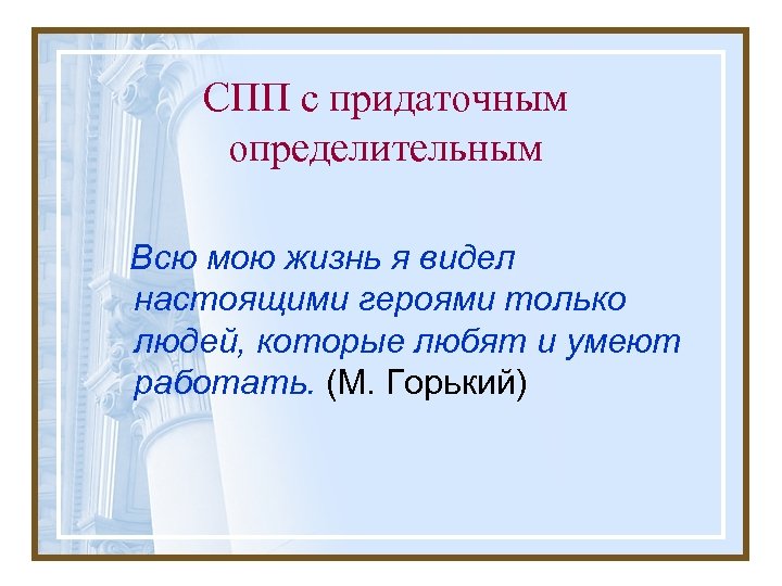 СПП с придаточным определительным Всю мою жизнь я видел настоящими героями только людей, которые любят и умеют работать. (М. Горький)