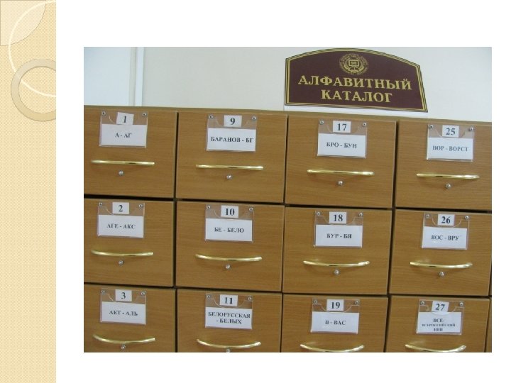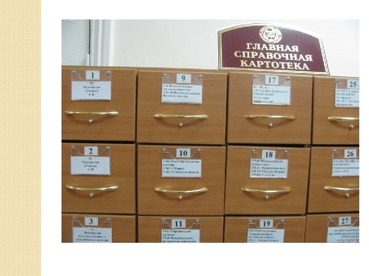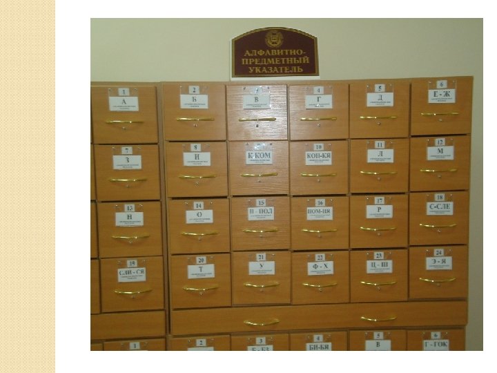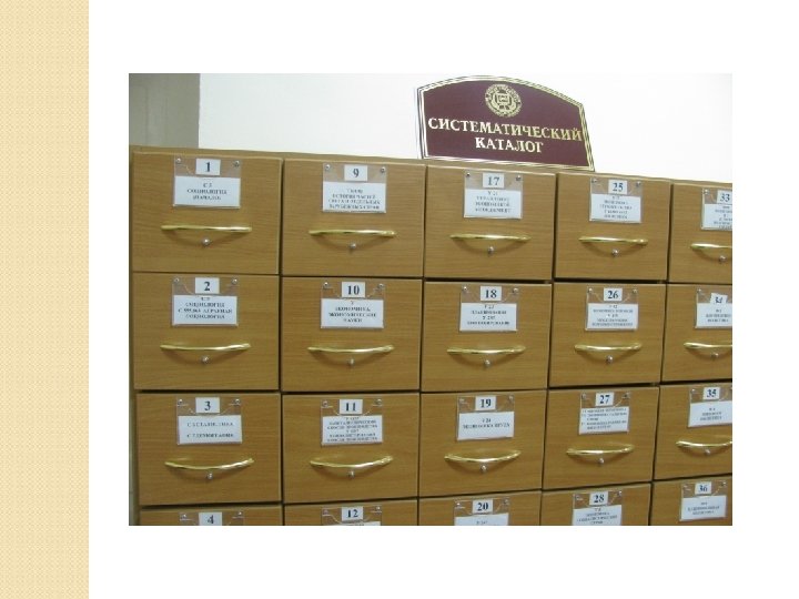 Систематический каталог Ящик систематического каталога • В каталожных ящиках помимо карточек имеются разделители. • Это картонные или пластиковые карточки, выступающие над основным массивом; • На разделителях указаны индексы разделов и их названия; • Они служат для того, чтобы облегчить поиск информации.