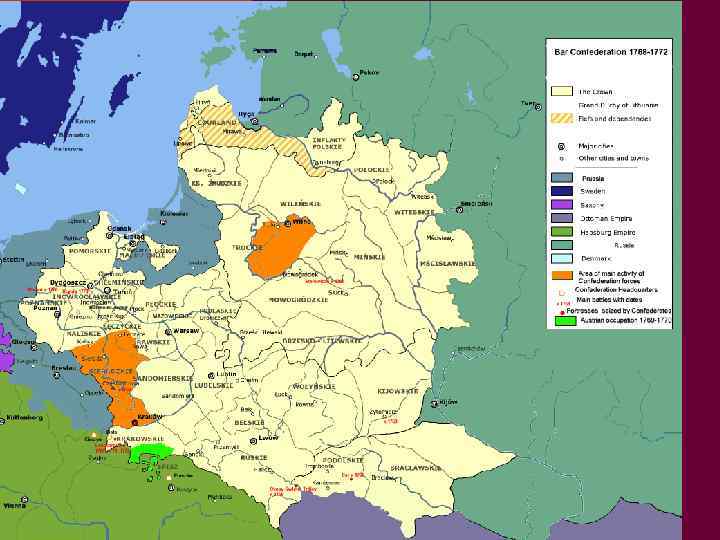 Барская канфедэрацыя У ходзе 4 -гадовай грамадзянскай вайны слабыя атрады барскіх канфедэратаў[1] не мелі ніякіх шанцаў на перамогу ў сутыкненні з расійскімі войскамі і атрадамі, вернымі С. А. Панятоўскаму. l [1] Канфедэратам дапамагалі: Аўстрыя (дазвол на падрыхтоўку на сваёй тэрыторыі атрадаў), Францыя (пасылала грошы і ваенных інструктараў), Турцыя (абвясціла вайну Расіі).