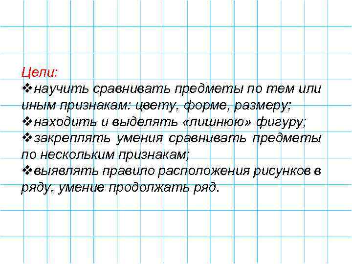 Цели: vнаучить сравнивать предметы по тем или иным признакам: цвету, форме, размеру; vнаходить и выделять «лишнюю» фигуру; vзакреплять умения сравнивать предметы по нескольким признакам; vвыявлять правило расположения рисунков в ряду, умение продолжать ряд.