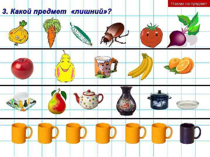 Нажми на предмет 3. Какой предмет «лишний» ?