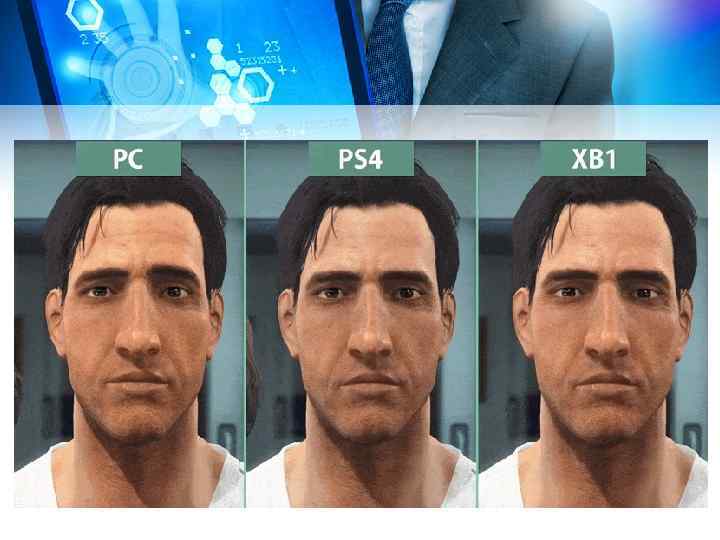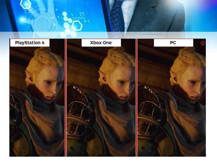Графика XBox One vs PS 4 сопоставлена по следующим характеристикам: • • • Количество блоков визуализации ROPs, которые отвечают за четкость выводимой картинки (чем их больше, тем лучше). Видеокарта приставки Sony имеет 32 таких блока, а Microsoft - в 2 раза меньше. Число основных вычислительных блоков также больше у Sony - 18 против 12. Кроме остального, графический процессор Play. Station 4 имеет преимущества за счет поддержки тесселяции, что положительно сказывается на качестве детализации объектов, и более мощный акселератор. И только один показатель, несмотря на все "плюшки" PS 4, добавляет бонусов Иксбокс - это тактовая частота GPU. У консоли от Microsoft она составляет 853 MHz против 800 у Sony. То есть, в целом графический процессор нового Иксбокса работает быстрее, поэтому визуальное качество графики той и другой платформы вполне сопоставимо. И если не быть излишне придирчивыми - различия между ними не так уж и велики.