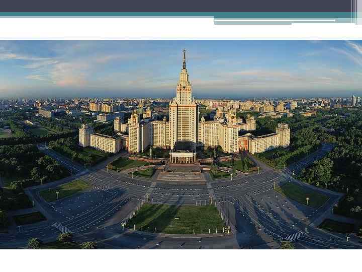Развитие инфраструктуры МГУ • Московский университет является ведущим университетом нашей страны. По последним данным репутационного рейтинга Thomson Reuters МГУ занял пятое место среди лучших университетов Европы. На сегодня наша главная задача — динамичное развитие, реализация масштабных инновационных проектов. Создание научно-технологической долины «Воробьевы горы» — это сопряжение фундаментальной науки, высоких технологий и деятельности национальных корпораций, обеспеченное мощным интеллектуальным потенциалом. Это и новые учебно-научные корпуса и лаборатории, общежития для студентов, спортивный комплекс, музейное пространство. Это в то же время и комфортная среда для проживания, общения и отдыха, благоустроенная территория с парковыми зонами и велосипедными дорожками. Реализация этого проекта укрепит позиции Московского университета в мировом научно-образовательном пространстве, откроет новую страницу в истории российского университетского образования и создаст новый кадровый и высокотехнологичный ресурс для будущей России
