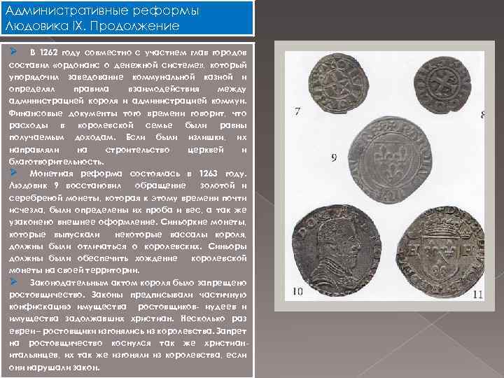 Административные реформы Людовика IX. Продолжение Ø В 1262 году совместно с участием глав городов составил «ордонанс о денежной системе» , который упорядочил заведование коммунальной казной и определял правила взаимодействия между администрацией короля и администрацией коммун. Финансовые документы того времени говорит, что расходы в королевской семье были равны получаемым доходам. Если были излишки, их направляли на строительство церквей и благотворительность. Ø Монетная реформа состоялась в 1263 году. Людовик 9 восстановил обращение золотой и серебреной монеты, которая к этому времени почти исчезла, были определены их проба и вес, а так же узаконено внешнее оформление. Синьоркие монеты, которые выпускали некоторые вассалы короля, должны были отличаться о королевских. Синьоры должны были обеспечить хождение королевской монеты на своей территории. Ø Законодательным актом короля было запрещено ростовщичество. Законы предписывали частичную конфискацию имущества ростовщиков- иудеев и имущества задолжавших христиан. Несколько раз евреи – ростовщики изгонялись из королевства. Запрет на ростовщичество коснулся так же христианитальянцев, их так же изгоняли из королевства, если они нарушали закон.