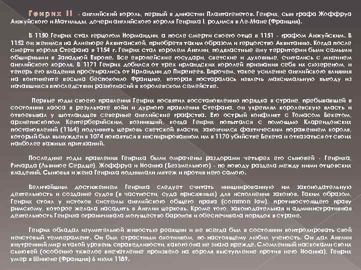- английский король, первый в династии Плантагенетов. Генрих, сын графа Жоффруа Анжуйского и Матильды, дочери английского короля Генриха I, родился в Ле-Мане (Франция). В 1150 Генрих стал герцогом Нормандии, а после смерти своего отца в 1151 - графом Анжуйским. В 1152 он женился на Алиеноре Аквитанской, приобретя таким образом и герцогство Аквитанию. Когда после смерти короля Стефана в 1154 г. Генрих стал королем Англии, подвластные ему территории были самыми обширными в Западной Европе. Все европейские государи, светские и духовные, считались с мнением английского короля. В 1171 Генрих добился от трех ирландских королей признания себя их сюзереном, и теперь его владения простирались от Ирландии до Пиренеев. Впрочем, такое усиление английского влияния на континенте весьма беспокоило Францию, которая постаралась извлечь максимальную выгоду из начавшихся впоследствии разногласий в королевском семействе. Первые годы своего правления Генрих посвятил восстановлению порядка в стране, пребывавшей в состоянии хаоса в результате войн и дурного правления Стефана, он укреплял королевскую власть и отвоевывал у шотландцев северные английские графства. Его острый конфликт с Томасом Бекетом, архиепископом Кентерберийским, возникший, когда Генрих попытался с помощью Кларендонских постановлений (1164) подчинить церковь светской власти, закончился фактическим поражением короля, который был вынужден в 1074 покаяться в инспирированном им в 1170 убийстве Бекета и отказаться от своих наиболее важных притязаний. Последние годы правления Генриха были омрачены раздорами четырех его сыновей - Генриха, Ричарда (Львиное Сердце), Жоффруа и Иоанна (Беззмельного) - по поводу раздела между ними отцовских владений. Сыновья и жена Генриха поднимали мятеж и против него самого. Величайшим достижением Генриха следует считать инициированную им законодательную деятельность и создание судов (в частности, суда присяжных) для исполнения законов. Таким образом, Генрих стоял у истоков системы английского общего права (common law), противостоящего праву римскому, которое желала насадить в Англии церковь. Кроме того, законодательная и административная деятельность Генриха ограничивала могущество баронов и обеспечивала порядок в стране. Генрих обладал изумительной живостью реакции и не всегда был в состоянии контролировать свой неистовый темперамент. Он был страстным охотником, по-настоящему любил ученость. Он дал Англии внутренний мир и такой уровень справедливости, какого она не знала прежде. Сломленный наскоками своих сыновей (особенно тяжелое впечатление произвело на короля выступление против него Иоанна), Генрих умер в Шиноне (Франция) 6 июля 1189.