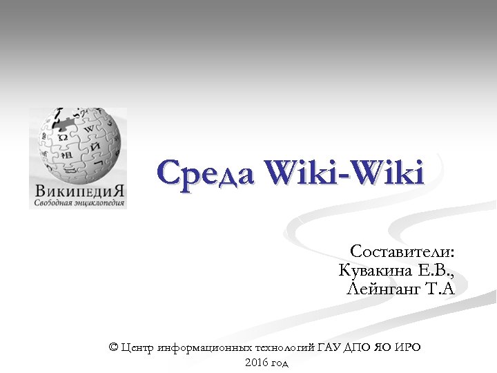 Среда Wiki-Wiki Составители: Кувакина Е. В. , Лейнганг Т. А © Центр информационных технологий ГАУ ДПО ЯО ИРО 2016 год