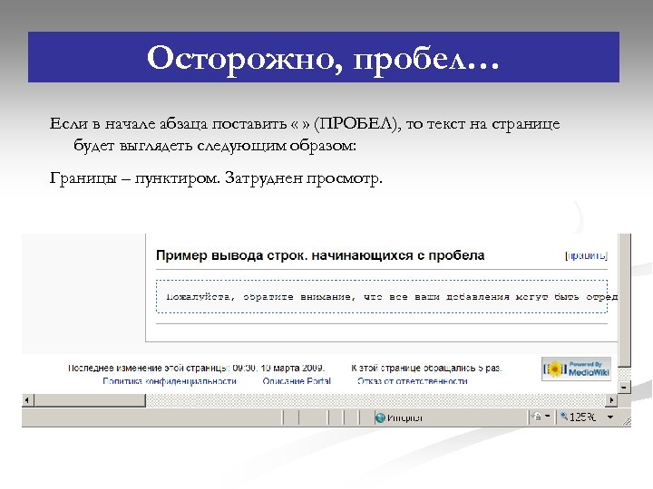 Осторожно, пробел… Если в начале абзаца поставить « » (ПРОБЕЛ), то текст на странице будет выглядеть следующим образом: Границы – пунктиром. Затруднен просмотр.
