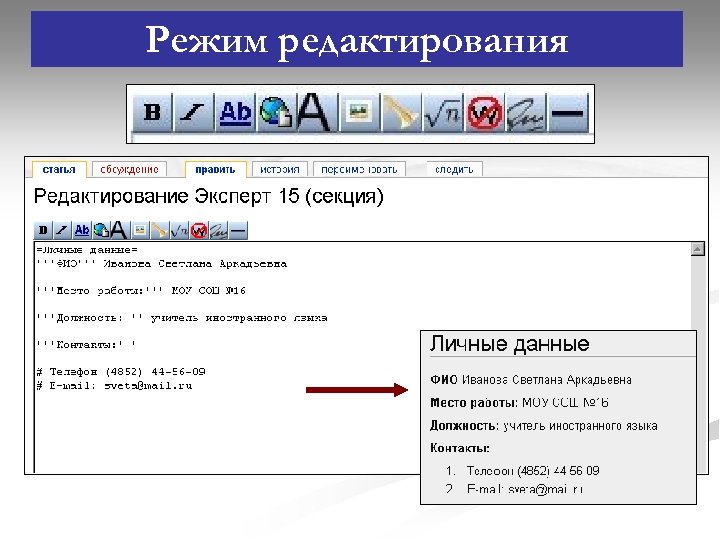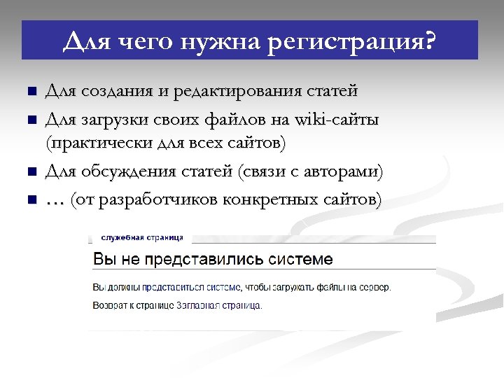 Для чего нужна регистрация? n n Для создания и редактирования статей Для загрузки своих файлов на wiki-сайты (практически для всех сайтов) Для обсуждения статей (связи с авторами) … (от разработчиков конкретных сайтов)