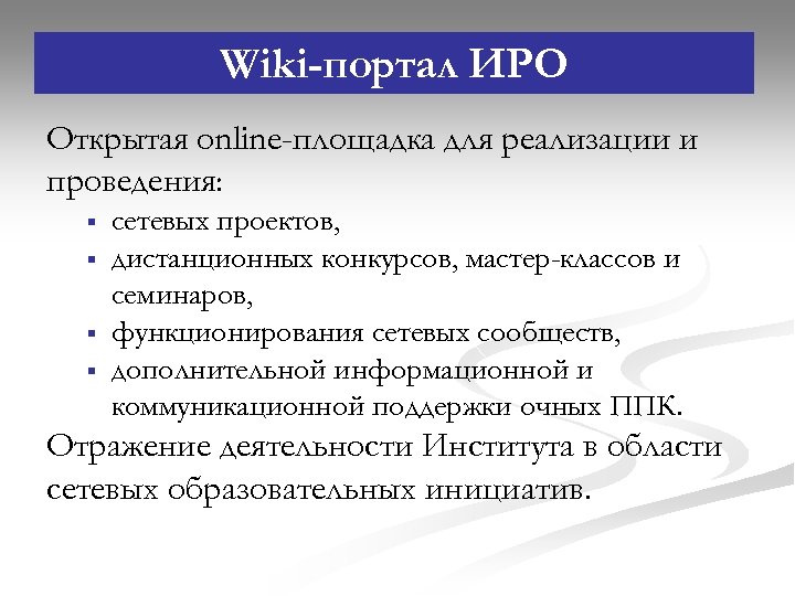 Wiki-портал ИРО Открытая online-площадка для реализации и проведения: § § сетевых проектов, дистанционных конкурсов, мастер-классов и семинаров, функционирования сетевых сообществ, дополнительной информационной и коммуникационной поддержки очных ППК. Отражение деятельности Института в области сетевых образовательных инициатив.