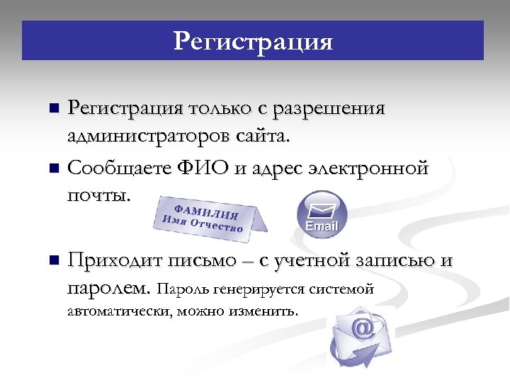 Регистрация только с разрешения администраторов сайта. n Сообщаете ФИО и адрес электронной почты. n n Приходит письмо – с учетной записью и паролем. Пароль генерируется системой автоматически, можно изменить.