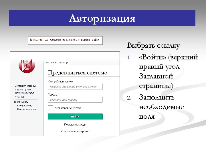 Авторизация Выбрать ссылку 1. «Войти» (верхний правый угол Заглавной страницы) 2. Заполнить необходимые поля