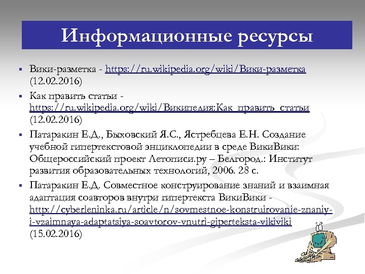 Информационные ресурсы § § Вики-разметка - https: //ru. wikipedia. org/wiki/Вики-разметка (12. 02. 2016) Как править статьи https: //ru. wikipedia. org/wiki/Википедия: Как_править_статьи (12. 02. 2016) Патаракин Е. Д. , Быховский Я. С. , Ястребцева Е. Н. Создание учебной гипертекстовой энциклопедии в среде Вики: Общероссийский проект Летописи. ру – Белгород. : Институт развития образовательных технологий, 2006. 28 с. Патаракин Е. Д. Совместное конструирование знаний и взаимная адаптация соавторов внутри гипертекста Вики http: //cyberleninka. ru/article/n/sovmestnoe-konstruirovanie-znaniyi-vzaimnaya-adaptatsiya-soavtorov-vnutri-giperteksta-viki (15. 02. 2016)