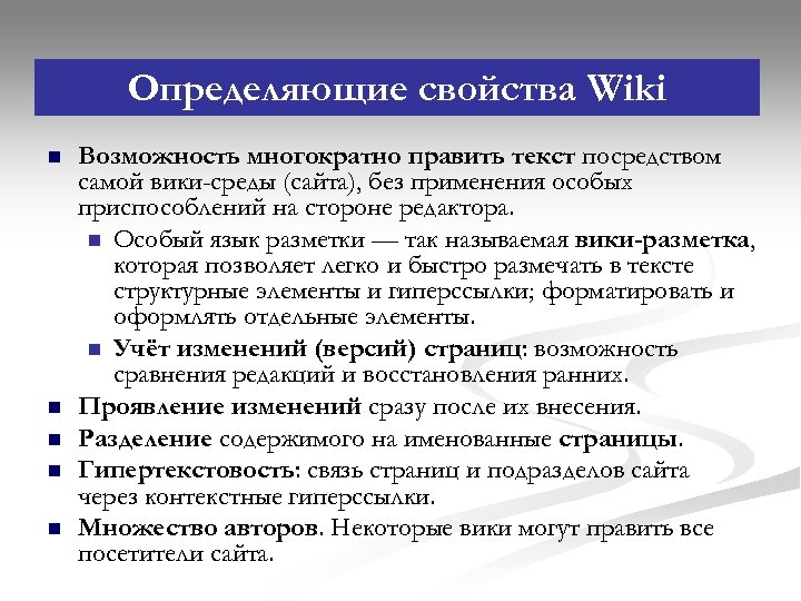 Определяющие свойства Wiki n n n Возможность многократно править текст посредством самой вики-среды (сайта), без применения особых приспособлений на стороне редактора. n Особый язык разметки — так называемая вики-разметка, которая позволяет легко и быстро размечать в тексте структурные элементы и гиперссылки; форматировать и оформлять отдельные элементы. n Учёт изменений (версий) страниц: возможность сравнения редакций и восстановления ранних. Проявление изменений сразу после их внесения. Разделение содержимого на именованные страницы. Гипертекстовость: связь страниц и подразделов сайта через контекстные гиперссылки. Множество авторов. Некоторые вики могут править все посетители сайта.