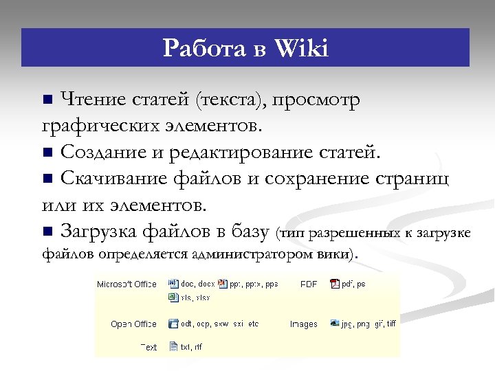 Работа в Wiki Чтение статей (текста), просмотр графических элементов. n Создание и редактирование статей. n Скачивание файлов и сохранение страниц или их элементов. n Загрузка файлов в базу (тип разрешенных к загрузке n файлов определяется администратором вики).