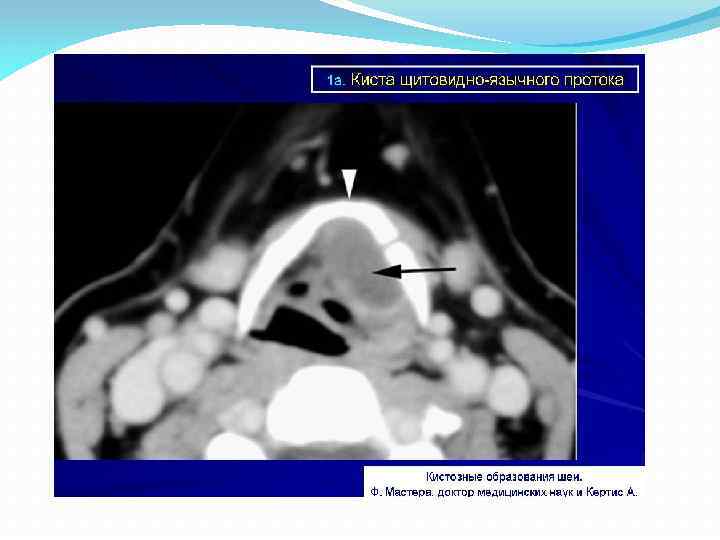 Эхографическая картина срединной кисты шеи у пациента 6 лет. На взаимоперпендикуляр ных сечениях передней поверхности шеи, несколько левее срединной линии, визуализируется овоидной формы эхонегативное образование с четкими контурами. За образованием акустическое усиление.