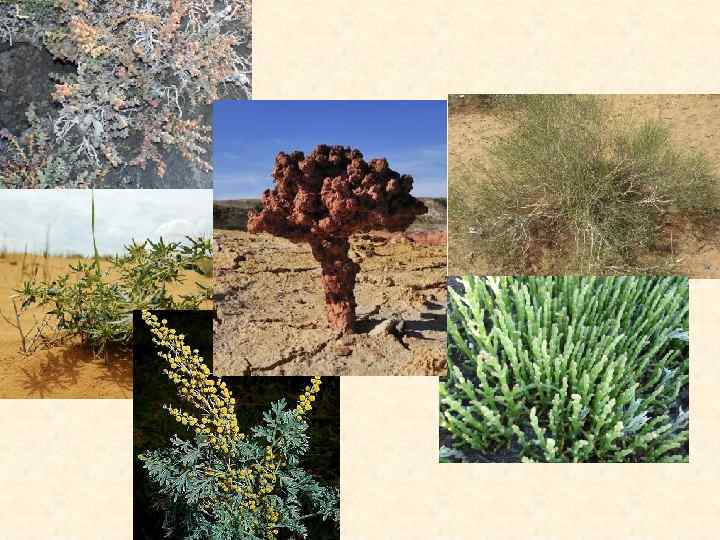 Полукустарники в северной глинистой пустыне представлены прежде всего различными видами полыней. Особенно распространена полынь белой земли — невысокие, приземистые «кусты» довольно тусклой серовато-зеленоватой окраски. Господство полыней характерно для незаселенных или слабо засоленных почв. Среди полукустарников встречаются и так называемые солянки — различные представители семейства маревых, причем такие, которые способны переносить засоление почвы (галофиты). Солянки, как и полыни, растут обычно в виде небольших приземистых «кустов» , нередко имеющих округлую форму. Одна из наиболее распространенных солянок северных глинистых пустынь — биюргун. Листья этого растения — очень мелкие чешуйки. Фотосинтез осуществляют молодые зеленые стебли текущего года. Недоразвитие листьев вплоть до почти полного их исчезновения — характерная черта растений пустынь. Другая распространенная солянка северных пустынь — кокпек. По внешнему виду это растение несколько сходно с биюргуном. Солянки — хорошие кормовые растения, они охотно поедаются скотом (прежде всего овцами и верблюдами). Роль солянок в растительном покрове особенно велика на засоленных почвах. Однако чистых зарослей они обычно не образуют и чаще всего растут совместно с полынями. Для северных пустынь характерно также отсутствие или нерачительное участие в растительном покрове эфемеров и