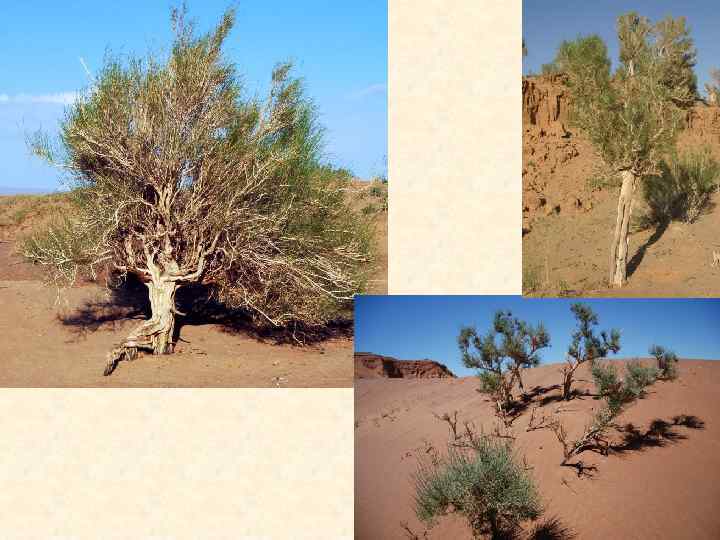 РАСТИТЕЛЬНОСТЬ ПУСТЫНИ В Средней Азии встречаются два вида саксаула: чёрный (с листочками в виде чешуек) и белый (с листочками в виде бугорков). Чёрный используют для посадок на солончаках. Только он способен расти на таких землях. Белый приживается даже в районе «мёртвых» песков. Поэтому его часто используют для закрепления подвижных, гонимых ветрами песчаных барханов. Саксаул зовут ещё разведчиком воды в пустынях: там, где грунтовые воды подходят к поверхности, вырастают стройные и высокие деревья саксаула. У большинства растений корневое давление – до 5 атмосфер, а у саксаула – до 100! С такой силой он высасывает из почвы крупицы влаги.