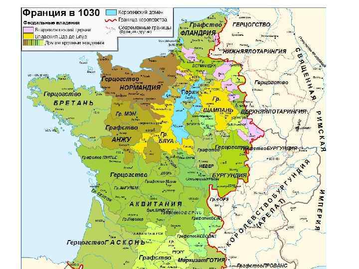 Герцогство Нормандия • Северная, приморская часть Франции • Подвергалась набегам викингов • Французский король Карл Простоватый в 911 году предложил норвежцу-изгнаннику Роллону эти земли, если тот принесет вассальную клятву французскому королю и примет христианство • Норманны принимают христианство и усваивают французский язык
