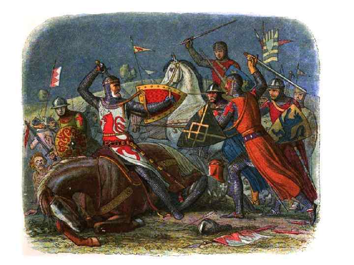 Битва при Гастингсе – 1066 год «Бились ожесточенно большую часть дня, и ни одна из сторон не уступала. Убедившись в этом, Вильгельм дал сигнал к мнимому бегству с поля брани. В результате этой хитрости боевые ряды англов расстроились, стремясь истреблять беспорядочно отступающего врага, и тем была ускорена собственная их гибель; ибо нормандцы, круто повернувшись, атаковали разъединенных врагов, и обратили их в бегство. Так, обманутые хитростью, они приняли славную смерть, мстя за свою отчизну. Но все же они и за себя отомстили с лихвой, и, упорно сопротивляясь, оставляли от своих преследователей груды убитых. Завладев холмом, они сбрасывали в котловину нормандцев, когда те, объятые пламенем [битвы], упорно взбирались на высоту, и истребили всех до единого, без труда пуская в подступающих снизу стрелы и скатывая на них камни. »