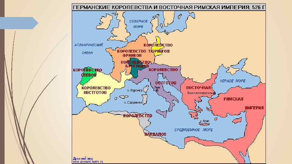 Варварские королевства Территория Племя Время существования Юго-Западная часть Галлии и Испания Вестготы 418 -718 гг. Северо-Восточная Галлия Франки 481 -843 гг. Италия Остготы 488 -555 гг. Британские острова Англы и саксы V-VI вв. Северная Африка Вандалы 429 -534 гг.