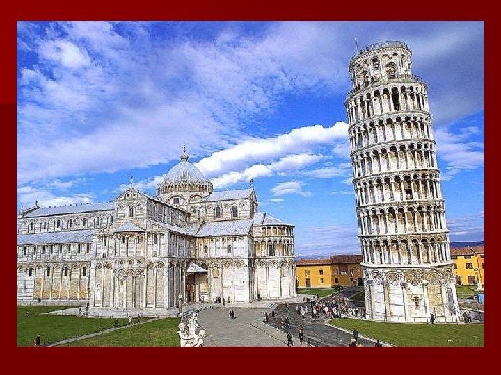 Пиза нская башня — колокольная башня, часть ансамбля Пизанского собора. Строительство башни было закончено в 1360 году. Башня имеет 294 ступеньки. Высота башни составляет 56, 7 м на самой высокой стороне. Диаметр основания — 15, 54 м. Пизанская башня "падает" наклонившись к югу. С того времени, как начались постоянные измерения башни в 1911 году, было зафиксировано, что вершина наклоняется на 1, 2 миллиметра в год. На сегодняшний день, вершина Пизанской башни наклонена на 5, 3 м от центра.
