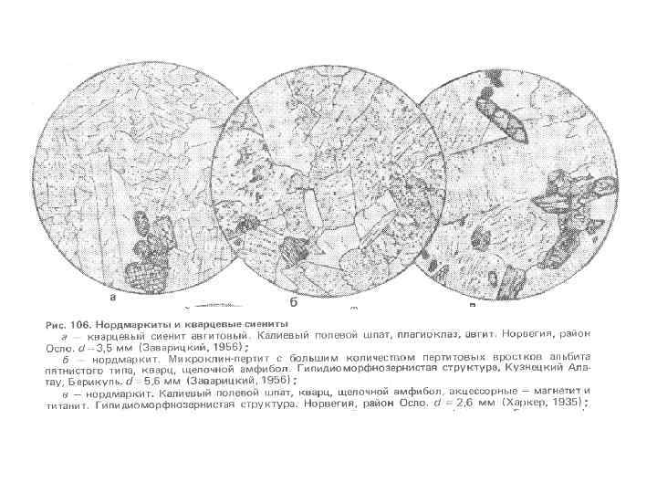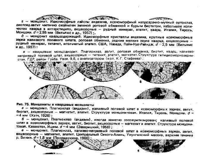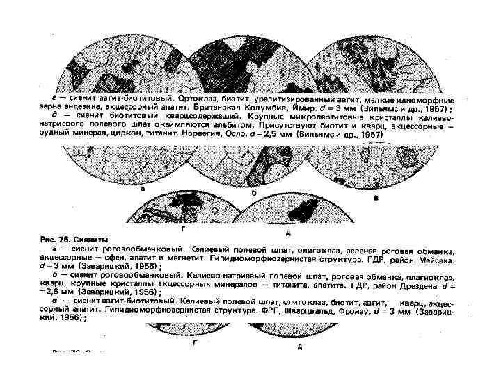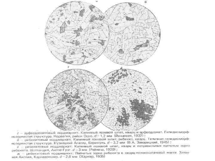 Структуры диоритов. а — диорит меланократовый (меладиорит). Зеленая роговая обманка, андезин и акцессорные -магнетит и апатит. Призматическизернистая (диоритовая) структура. Урал, Бердяуш. d = 3, 3 мм (Заварицки. Й, 1937); 6 — диорит с субофитовой структурой. Зеленая роговая обманка, в ксеноморфных зернах частично замещенная бледно-окрашенным актинолитом; плагиоклаз серицитизирован. Урал, гора Куйбас. d=5, 6 мм (Заварицки. Й, 1956); в — биотит-гиперстеновый диорит. Гиперстен, биотит, андезин в таблитчатых кристаллах и акцессорные — апатит и магнетит. Немного кварца в резко ксеноморфных зернах. ФРГ, Оденвальд. d=-4, 3 мм (Заварицкий, 1956) ; г — гиперстеновый диорит. Гиперстен большей частью замешен бледно-зеленым волокнистым актинолитом; плагиоклаз и акцессорный магнетит. Единичные чешуйки биотита. Типичная призматическизернистая структура. ВНР, Хеймниц. d =-4 мм (Половинкина и др. , 1948);