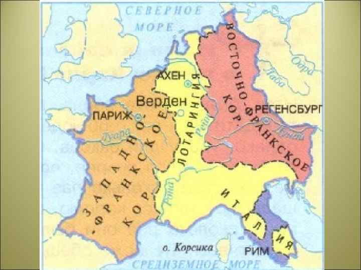 В 843 г. Карл Великий разделил империю между своими сыновьями Верденский раздел Западнофранкское государство (будущая Франция) Восточно- франкское государства (будущая Германия) Королевство Лотаря (Будущая Италия)