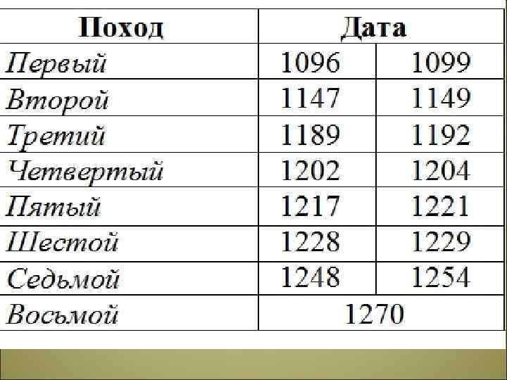 Номер похода Первый Второй Третий Годы Страны-участницы 1096 -1099 Основные события Франция, Германия и Италия Итоги Церковный собор 1095 г. – папа Урбан II выступил с призывом освободить гроб Господень в Иерусалиме 1097 г. – освобождение Никеи 1098 г. – захват Эдессы 1099 г. – захват Иерусалима 1147 -1149 Франция (Людовик VII и 1144 г. – эмир Мосула отнял Конрад III) Эдессу Создание государства Триполи, княжества Антиохского, графства Эдесского и Иерусалимского королевства 1189 -1192 Неудача Четверты й 1201 -1204 Детский 1270 1187 г. - изгнание мусульманами крестоносцев из Иерусалима Папа Иннокентий III Против Византии Цель – вернуть Иерусалим 1212 Восьмой Германия (Фридрих Барбаросса), Франция (Филипп II Август), Англия (Ричард Львиное Сердце) Полная неудача Разграбление Константинополя Создание Латинской империи. Распад Византии на Эпирское царство, Никейскую и Трапезундскую империи Тысячи детей погибли или были проданы в рабство Последний Полная неудача
