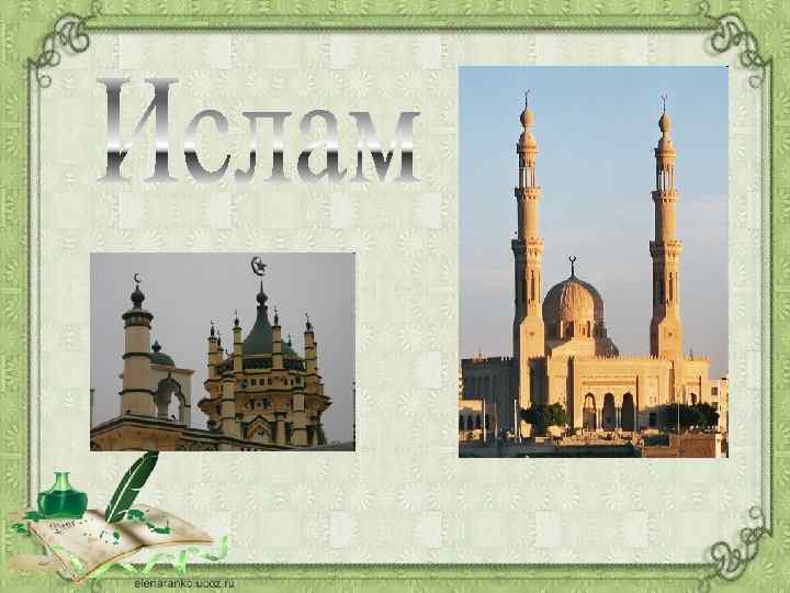 Ислам • Ислам — одна из трех мировых религий (наряду с христианством и буддизмом). Это самая молодая из мировых религий. Ее название в переводе с арабского языка означает «покорность, предание себя Богу» . Последователей ислама называют мусульманами. Возникла эта религия в начале 7 века на территории современной Саудовской Аравии. До этого местные племена арабов были язычниками, то есть поклонялись множеству самых разных богов. В то же время в Аравию активно проникали идеи христианства и иудаизма (религия евреев). С ними был знаком и основатель ислама пророк Мухаммед. Согласно преданию, он получил от Бога (по-арабски: Аллах) откровение, которое слово в слово записал в священной книге мусульман — Коране.