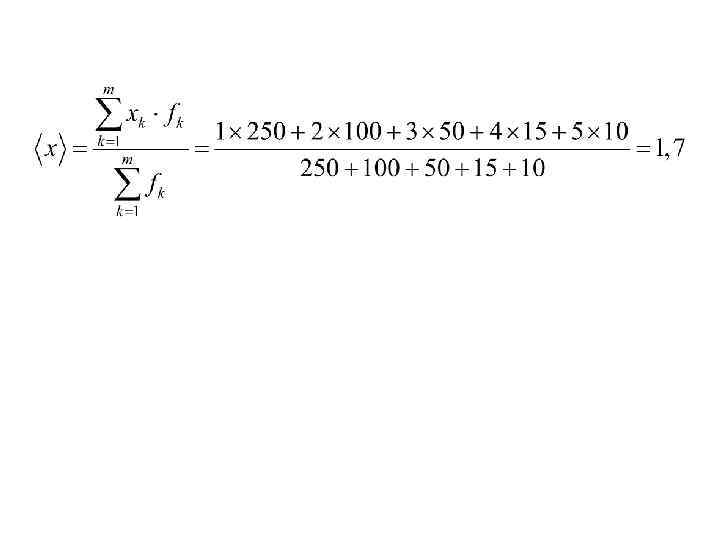 Пример 1. В следственном отделе районного УВД находятся дела о хищении имущества, характеризующиеся следующими данными: Число обвиняемых 1 2 3 4 5 Число дел 250 100 50 15 10 Определить среднее число обвиняемых на одно уголовное дело.