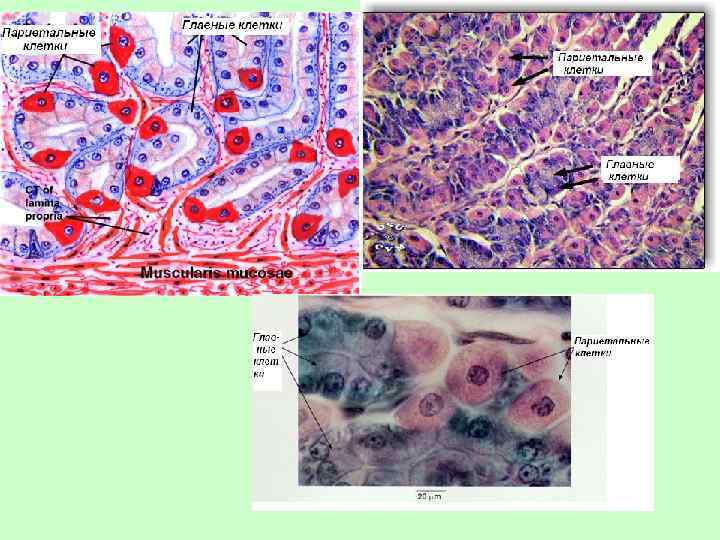 Клетки собственных желез • недифференцированные • шеечные слизистые (А) • париетальные (В) • главные экзокриноциты (Б) • эндокринные (Г)