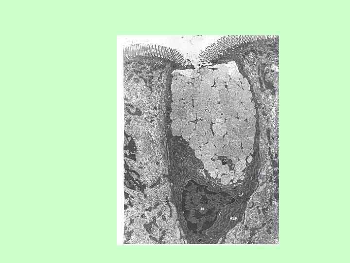 Бокаловидные клетки • ядро в базальной части (ножке); • крупные слизистые гранулы, содержащие гликопротеины и ГАГ в расширенной апикальной части • 2 -3 секреторных цикла в течение жизни (2 -4 суток).