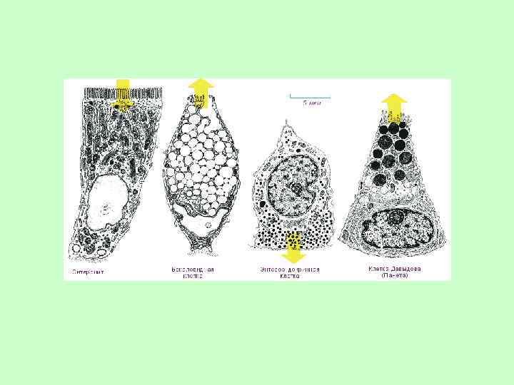 Клетки с ацидофильной зернистостью (Панета) • на дне крипт; • пирамидная форма: широкое основание и узкая апикальная часть, заполненная крупными ацидофильными гранулами (белковополисахаридный комплекс, цинк и лизоцим) • Обновляются медленно (3 -4 недели).