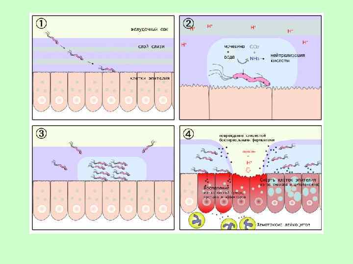 Слизисто-бикарбонатный барьер • Предотвращает механические повреждения слизистой оболочки и её переваривание желудочным соком. • При неблагоприятных условиях барьер разрушается в течение нескольких минут → гибель эпителиоцитов, отёк, кровоизлияния. • Факторы, разрушающие барьер: • стресс, психосоматические расстройства, аспирин, этанол, соли желчных кислот, Helicobacter pylori • Эпителий полностью обновляется за 1 -3 сутки.