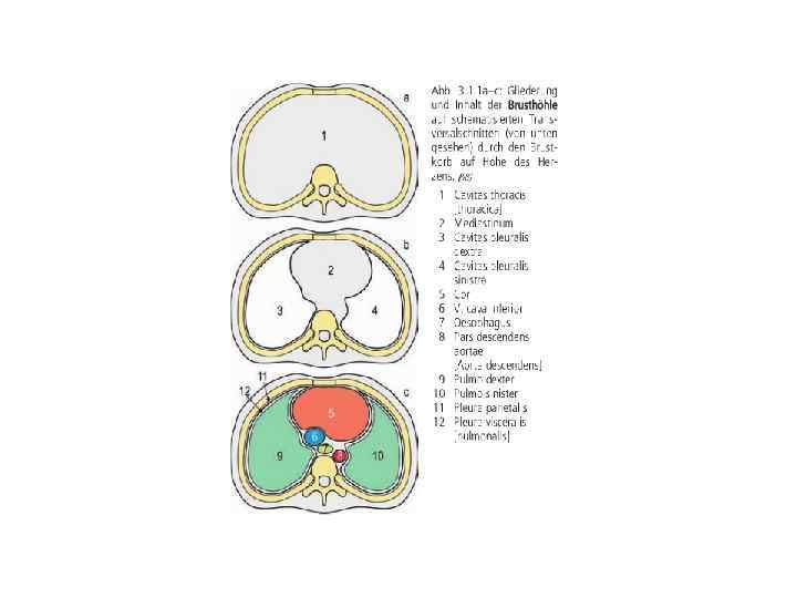 Mediastinum superior Mediastinum inferior Thymus Mediastinum anterior: A. et v. thoracica interna Lnn. parasternalis Arcus aortae: Truncus brachiocephalicus A. carotis communis sin (проксимальный отдел) A. subclavia sin (проксимальный отдел) Mediastinum medius: Cor V. cava superior Aorta ascendens Truncus pulmonalis: Aa. pulmonales Vv. pulmonales V. cava superior: V. brachiocephalica dextra Trachea Esophagus N. phrenicus Mediastinum posterius: V. cava inferior N. phrenicus N. vagus: N. laryngeus reccurens NN. cardiaci * Esophagus Aorta descendens V. cava inferior Ductus thoracicus Truncus sympaticus Граница – по заднему краю корня легкого (трахеи и бронхов)