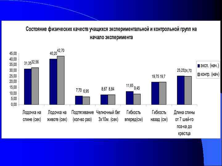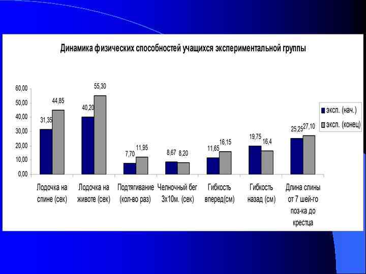 Сравнение ОДА КГ и ЭГ на конец преобразующего эксперимента Длина спины от7 шейого поз-ка до крестца Гибкость назад (см) Гибкость вперёд (см) 20 25, 65 18, 60 9, 88 Х(max ) 20 32 24 15 X(min ) 20 14 3 σ 3, 21 2, 67 3, 21 m 0, 74 0, 61 0, 74 Х 20 27, 10 16, 40 16, 15 Х(max ) Экспериментальна я группа n Х Контрольная группа 20 33 21 20 X(min ) 24 12 10 σ 2, 41 2, 7 m 0, 55 0, 62 t 1, 57 3, 28 6. 3 p >0, 05 < 0, 05