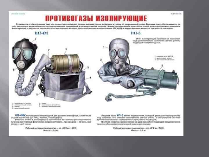 Изолирующие противогазы (ИП-4 М, ИП-4 МК, ИП-5, ИП-46, ИП-46 м) являются специальными средствами защиты органов дыхания, глаз, кожи лица от всех вредных примесей, содержащихся в воздухе. Их используют в том случае, когда фильтрующие противогазы не обеспечивают такую защиту, а также в условиях недостатка кислорода в воздухе. Необходимый для дыхания воздух обогащается в изолирующих противогазах кислородом в регенеративном патроне, снаряжённом специальным веществом (перекись и надперекись натрия). Противогаз состоит из : 1. лицевой части; 2. регенеративного патрона; 3. дыхательного мешка; 4. каркаса и сумки.