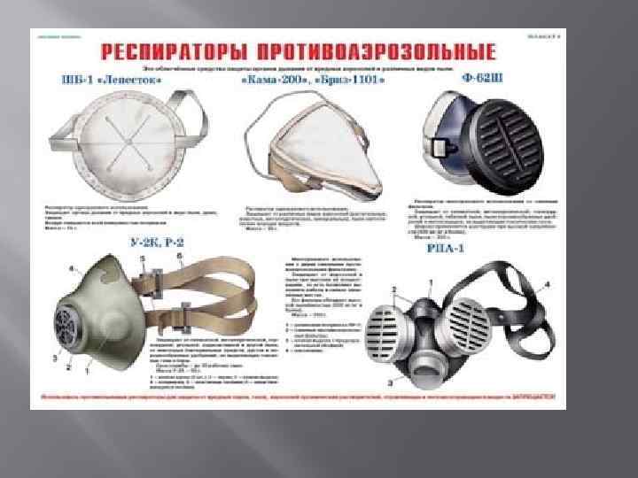 Респираторы, противопыльные тканевые маски и ватно-марлевые повязки В системе гражданской обороны наибольшее применение имеет респиратор Р-2. Респираторы применяются для защиты органов дыхания от радиоактивной и грунтовой пыли и при действиях во вторичном облаке бактериальных средств. Респиратор Р-2 представляет собой фильтрующую полумаску, снабжённую двумя клапанами входа и одним клапаном выхода (с предохранительным экраном), оголовьем, состоящим из из эластичных тесёмок и носовым зажимом. Если во время пользования респиратором появится много влаги, то рекомендуется его на 1 – 2 минуты снять, удалить влагу, протереть внутреннюю поверхность и снова надеть.
