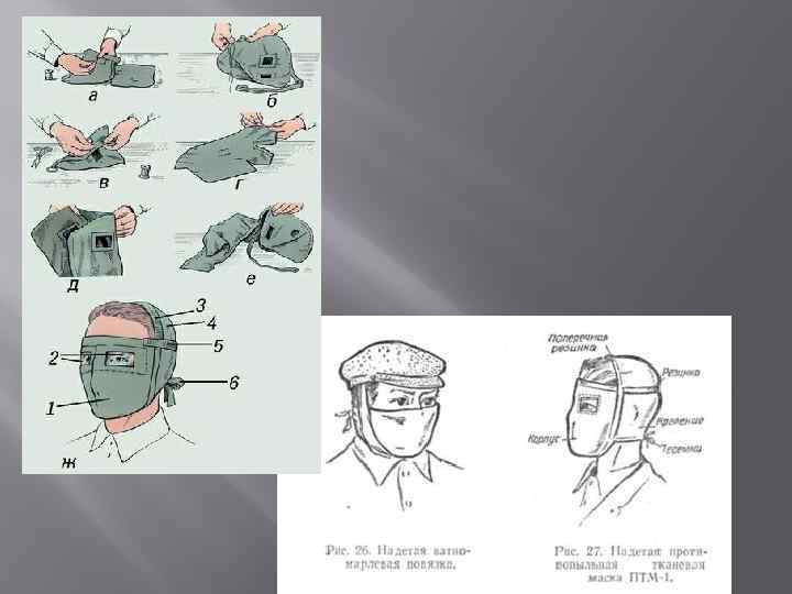 Противопыльная тканевая маска ПТМ-1 и ватно – марлевая повязка предназначаются для защиты органов дыхания человека от радиоактивной пыли и при действиях во вторичном облаке бактериальных средств. От отравляющих веществ они не защищают. Изготавливает маски и повязки преимущественно само население. Маска состоит из двух основных частей – корпуса и крепления. Корпус сделан из 2 – 4 слоёв ткани. В нём вырезаны смотровые отверстия со вставленными в них стёклами. На голове маска крепится полосой ткани, пришитой к боковым краям корпуса. Плотное прилегание маски к голове обеспечивается при помощи резинки в верхнем шве и завязок в нижнем шве крепления, а также при помощи поперечной резинки, пришитой к верхним углам корпуса маски. Воздух очищается всей поверхностью маски в процессе его прохождения через ткань при входе. Маску может изготовить каждый рабочий или служащий. Маску надевают при угрозе заражения радиоактивной пылью. При выходе из заражённого района при первой возможности её дезактивируют : чистят (выколачивают радиоактивную пыль), стирают в горячей воде с мылом и тщательно прополаскивают, меняя воду.