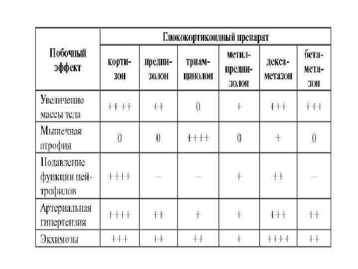 Побочные эффекты обычно обратимы и исчезают после снижения доз или отмены препарата. По показаниям назначают гипотензивные или седативные средства, препараты калия, мочегонные средства. Обострение хронической инфекции предупреждают назначением адекватных доз антибиотиков. Катаболическое действие глюкокортикоидов можно уменьшить анаболическими средствами и препаратами кальция. При длительной, особенно многолетней, глюкокортикоидной терапии развивается стойкая, но обратимая недостаточность коры надпочечников, которая может приводить в ряде случаев к смерти в связи с неожиданными стрессорными ситуациями (травмы, операции и т. д. ). Поэтому даже при умеренной дополнительной нагрузке на надпочечники целесообразно повысить суточную дозу ГК на 1 таблетку (начинать повышение сделует за 1 день до увеличения нагрузки, заканчивать - через 1 день после ее прекращения).