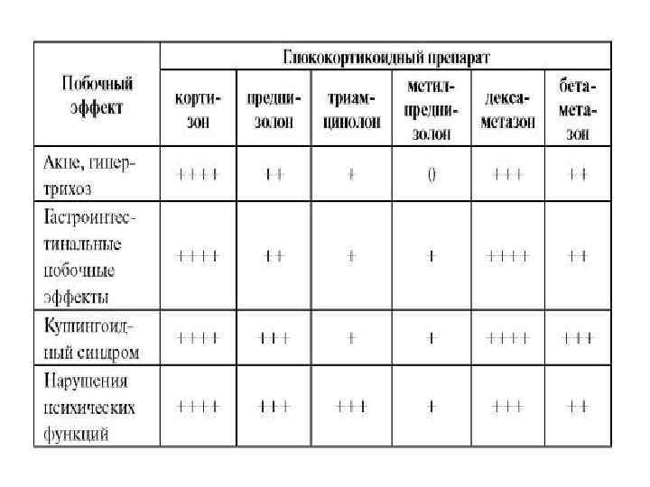Побочные эффекты системных глюкокортикоидов • Миопатии, остеопороз. • Неустойчивое настроение, психоз. • Ульцерогенноедействие, кровотечения, эзофагиты, диспепсии. • Задержка полового созревания, дисменорея, стероидный диабет, замедление роста у детей. • Артериальная гипертензия, задержка натрия и воды, отеки, гипокалиемия. • Активизация оппортунистических и латентных инфекций. • Глаукома, задняя субкапсулярная катаракта. • Гипергликемия, гиперлипидемия, повышение аппетита, кушингоидный синдром, отрицательный азотистый баланс.
