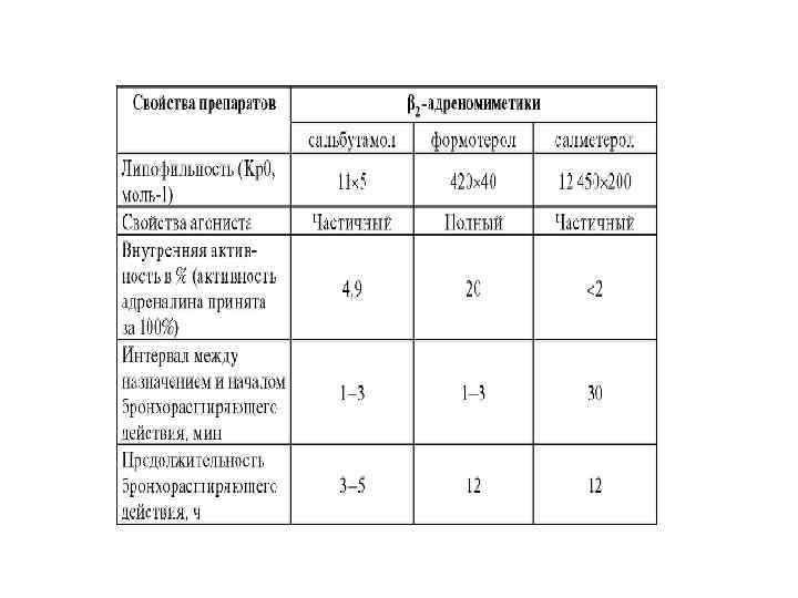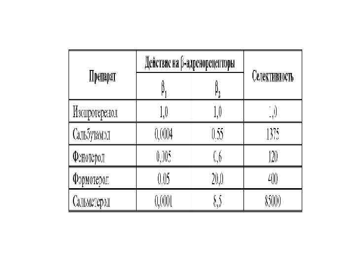 Р 2 -адреномиметики 1. Препараты короткого действия: • Фенотерол (Беротек). • Сальбутамол (Вентолин). • Тербуталин (Бриканил). 2. Препараты пролонгированногодействия: • Формотерол (Форадил). • Сальметерол (Серевент). • Индакатерол.
